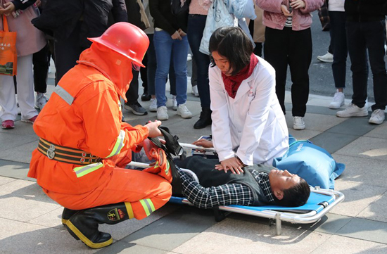 随着烟雾弹点燃,演练正式开始,科技楼内报警装置启动,学校保卫处消防中心接到火警信号后,立即开启消防应急预案。在第一时间内,楼内实验室管理人员立即引导学生用毛巾捂住口鼻、弯腰降低重心,沿着规定逃生路线有序疏散,快速逃离至一楼安全区域。演练中,校内微型消防站消防人员还向在场师生开展了人员搜救、伤员救护、灭火器使用、水枪打靶等演练。整个演练过程快速、安全、有序,并取得圆满成功。