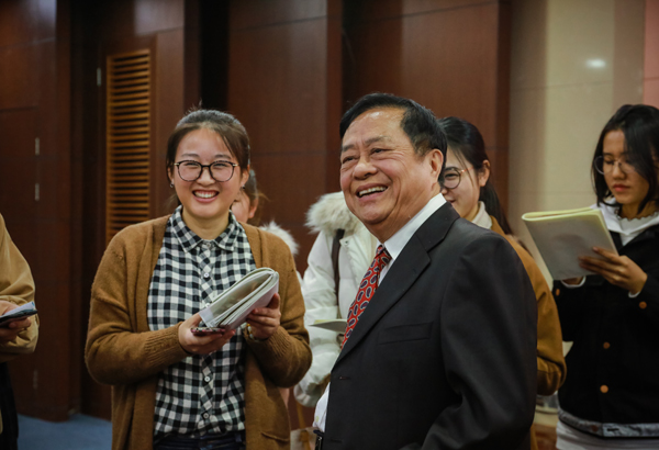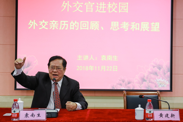 本网讯 11月22日下午,外交学院原党委书记兼常务副院长袁南生应邀来我校作题为《外交亲历的回顾、展望与思考》的国际形势政策报告。校党委书记李金昌热情会见了袁南生大使。校党委副书记黄建新主持报告会。