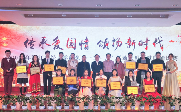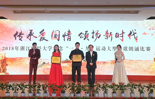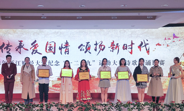 本网讯 12月6日,纪念“一二•九”运动大型诗歌朗诵比赛在我校下沙校区举行。校党委副书记黄建新,校党委委员、宣传部部长徐晓东与相关职能部门、各学院负责人和师生代表600余人等共同观看了本次比赛。