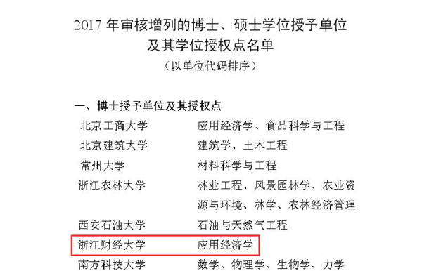 5月10日,国务院学位委员会正式下发了《关于下达2017年审核增列的博士、硕士学位授予单位及其学位授权点名单的通知》(学位〔2018〕19号),学校正式成为博士学位授予单位,应用经济学获批为博士学位授权一级学科,自批准之日起,可开展招生、培养和学位授予工作。
