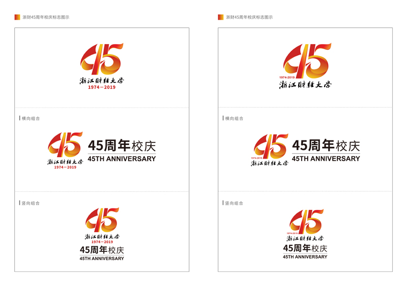 校庆徽标以数字“45”为主体,“4”的左侧和“5”的上部分别为风帆雕塑和钱江浪潮,风帆的正反面图形分别为财经缩写“CJ”,寓意以风华作帆,栉风沐雨,砥砺前行,勇立潮头,共创辉煌。