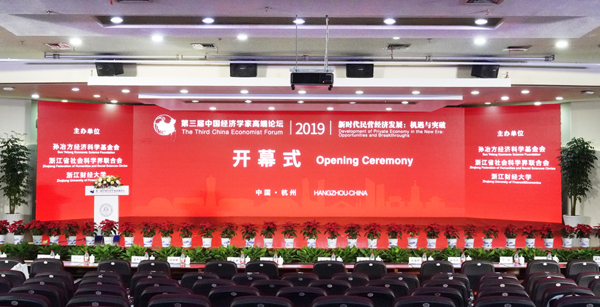 本网讯 4月27日,由孙冶方经济科学基金会、浙江省社会科学界联合会及我校共同主办的第三届中国经济学家高端论坛在下沙校区举行。本届论坛的主题是“新时代民营经济发展:机遇与突破”。来自中国国际经济交流中心、国务院发展研究中心、中国社科院等科研院所和浙江大学、南开大学等高校的经济学家、政府代表、实业界精英、校友代表以及校领导班子成员、师生代表等共计600余人出席开幕式。论坛开幕式和主旨报告分别由校党委副书记卢新波、副校长李占荣主持。