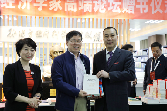 本网讯 4月27日,第三届中国经济学家高端论坛在我校下沙校区举行。论坛期间,与会的重庆市原市长、第十二届全国人大财政经济委员会副主任委员、中国国际经济交流中心副理事长黄奇帆,国务院发展研究中心原副主任、孙冶方经济科学奖获得者侯云春,中国国际经济交流中心原副秘书长、中华全国工商业联合会研究室原主任、大成企业研究院副院长陈永杰,中国孙冶方经济科学基金会副理事长武克钢,中国社会科学院研究生院原院长、民营经济研究中心主任刘迎秋,上海证券交易所上市公司治理专家委员会专家委员、亚商集团董事长、孙冶方经济科学奖获得者陈琦伟,浙江大学文科资深教授、浙江大学民营经济研究中心理事长史晋川,浙江省工业和信息化研究院院长兰建平,原农业部农业研究中心研究员、孙冶方经济科学奖得主蒋中一等国内学者专家,在孙冶方经济科学基金会副秘书长周济,校党委书记李金昌、党委副书记卢新波、副校长李占荣等陪同下,先后来到图书馆出席“致礼先贤、荟萃学术——第三届中国经济学家高端论坛赠书仪式”。