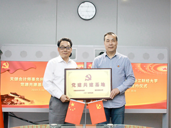 本网讯 5月10日,学校与天健会计师事务所举行党建共建基地签约仪式。校党委书记李金昌,党委副书记卢新波,全国人大代表、天健会计师事务所党委书记、首席合伙人胡少先,天健管委会委员、副总裁王国海,天健副总裁、财务总监傅芳芳,天健党委副书记、副主任会计师吴杰等出席仪式。