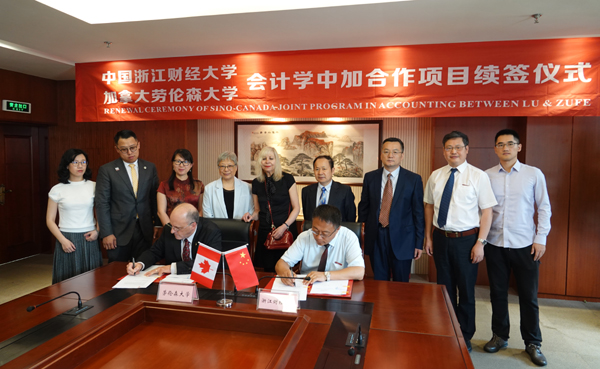 本网讯 6月15日,学校与加拿大劳伦森大学举行会计学中加合作项目续签仪式。副校长李占荣亲切会见了加拿大劳伦森大学校长皮埃尔·桑德一行,并共同签署了协议书。