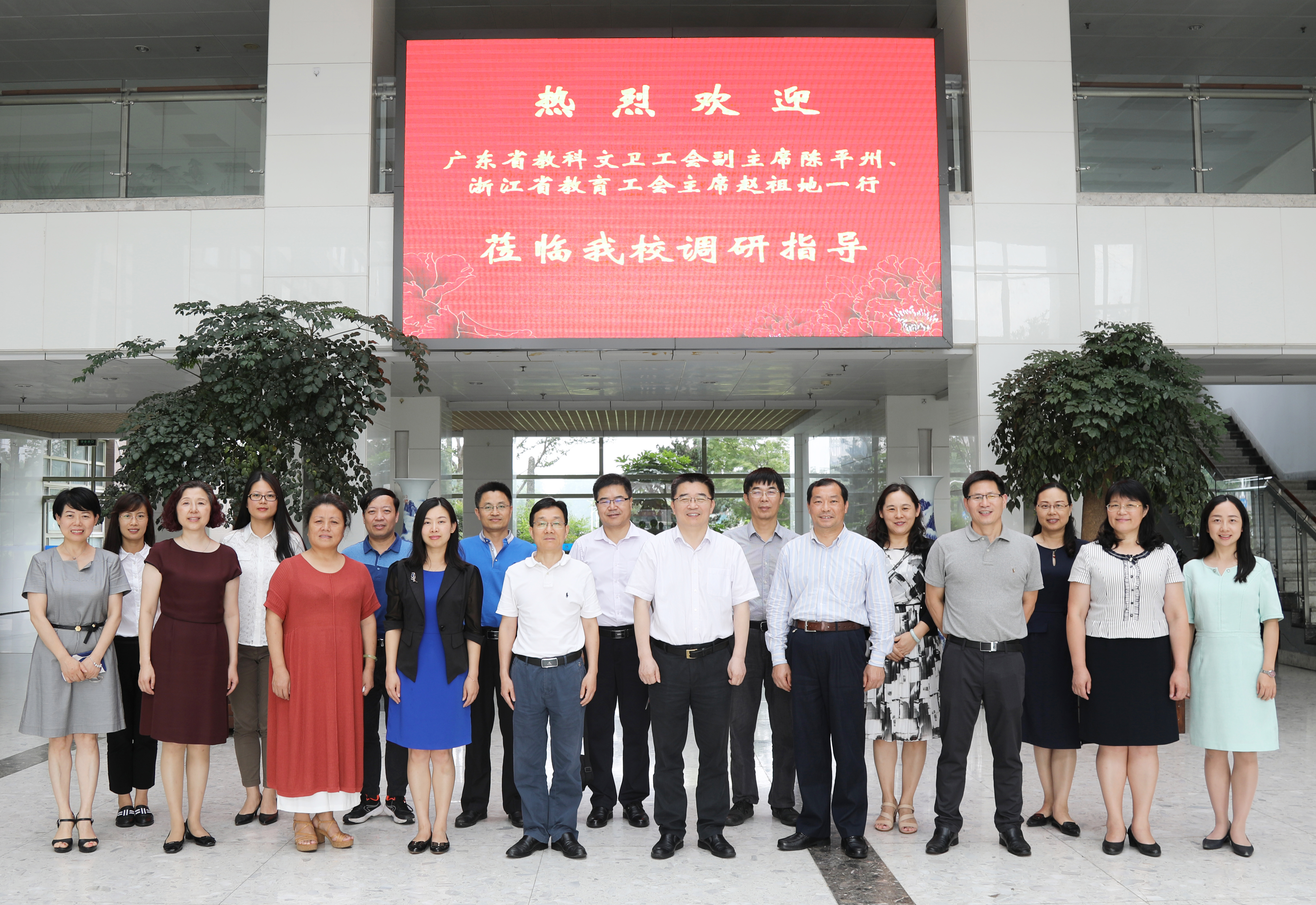 本网讯 6月26日,广东省教科文卫工会副主席陈平州一行来我校调研。省教育工会主席赵祖地主持交流座谈会。校党委副书记、工会主席卢新波热情接待了来访客人。