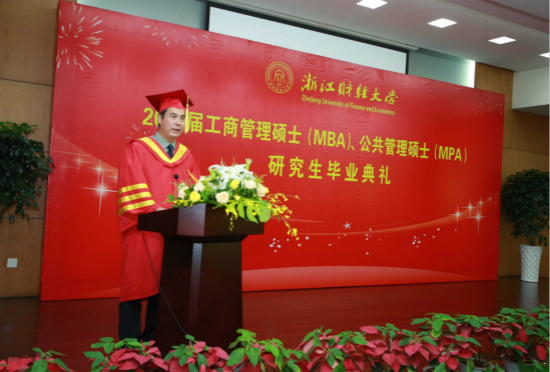 导师代表、工商管理学院(MBA学院)胡孝德,MPA亲友代表、2019届毕业生喻万芹同学的先生钱国忠先生,毕业生代表、工商管理学院MBA学生司文,在校生代表、MPA学生黄坤分别在典礼上发言。