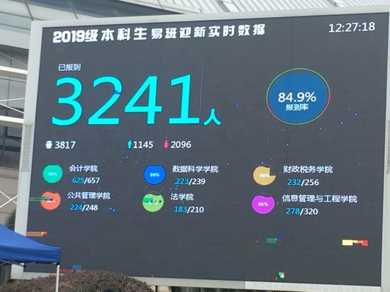 学校专门设立了新生报到大数据显示屏,实时显示全校报到情况。学校还专门为家庭经济困难的同学设立了绿色通道,宣传资助政策,提供便捷服务,并赠送包含学习用品的爱心礼包。