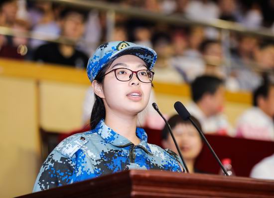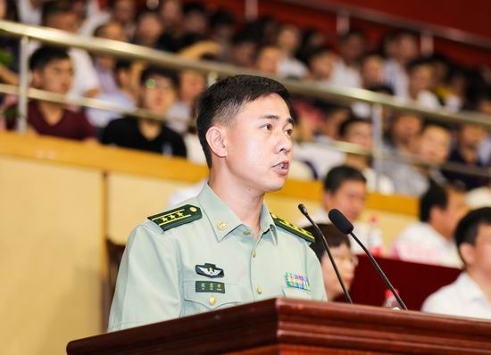 倪慧祥代表全体承训教官发言。他承诺,全体军训教官将认真履行职责、严于律己,以良好的军人形象、过硬的军事素质,保质保量地完成军训任务。他对参训同学提出三点希望:一是要认清意义,端正思想。二要服从命令,刻苦训练。三是要热爱祖国,担当使命。