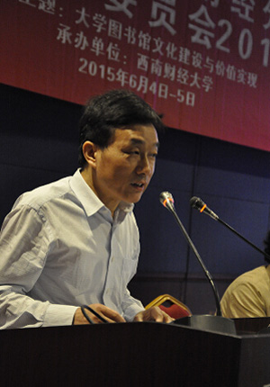 中国高教学会财经分会图书资料协作委员会秘书长、我校图书馆馆长张守凯向与会代表介绍了“全国财经高校图书馆特色资源自建共享方案”。