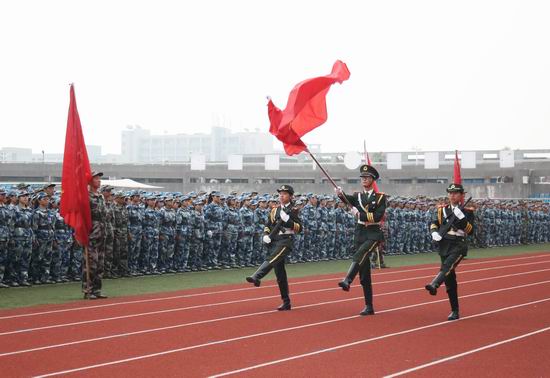 下沙校区西操场,处处旌旗飘飘,学生方阵整齐排列。在开场倒计时中,方阵不断变化,依次出现9至0的数字字样。数至零时,全场齐喊“进德修业、与时偕行”校训。在庄严的国歌声中,五星红旗冉冉升起,军训结业典礼正式开始。“迎军旗,全体起立!”全体参训学生、承训教官及在场领导起立,神情庄重严肃,对军旗行礼。
