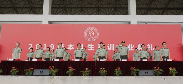 本网讯 9月12日,2019级本科生军训结业典礼在我校下沙校区举行。校党委副书记、军训师政委黄建新,党委委员、宣传部部长徐晓东,解放军承训部队教官和相关部门负责人等出席结业典礼。典礼由副校长励如孟主持。