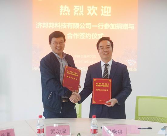本网讯 10月21日,中国金融研究院与济邦邦科技有限公司举行战略合作签约暨捐赠仪式。济邦邦科技有限公司向研究院捐赠人民币100万元,设立“济邦邦教育基金”,用于支持研究院发展、人才培养和项目研发。济邦邦科技有限公司总裁黄功成、中国金融研究院院长章晓洪等出席仪式。