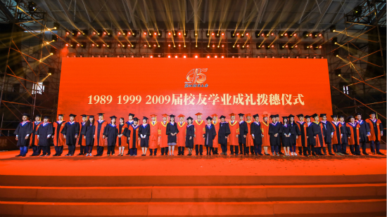 “情聚买球、追梦启新”汇土仪式将大会推向了高潮。全体师生合唱校歌《随你去远航》。1979、1989、1999、2009届秩年返校校友向母校报到并举行了返校校友学业成礼拨穗仪式、合影留念,建校45周年庆祝大会圆满结束。