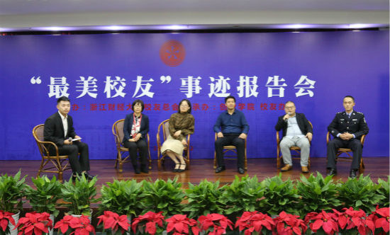 本网讯 11月2日,“最美校友”事迹报告会在下沙校区举行。校党委委员、纪委书记陈金方,金石资源集团股份有限公司副总裁、董事会秘书戴水君,南派泛娱首席执行官陈戴阁,浙江财务总监菁英会发起人、财能书院长三角分院名誉院长屈哲锋,余姚市公安局禁毒大队民警童昊翔,浙江海邦投资管理有限公司合伙人蒋经宇等5位杰出校友代表与我校师生代表200余人等出席报告会。