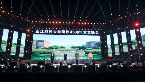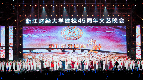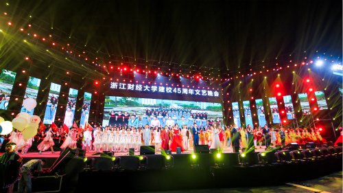 本场晚会以原创节目多、师生参与度高、校友参与广泛、艺术水准高为特点,融合思想性和艺术性,通过舞蹈、器乐、合唱、情景剧、武术、健美操等多种节目形式,全面展示了学校建校45年来的风雨历程和办学成绩,全校师生群策群力、迎难而上、抢抓机遇、砥砺前行,努力朝着建设国内一流、国际知名、特色鲜明的创新创业型财经大学目标不断前进。