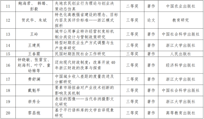 本网讯 近日,浙江省第二十届哲学社会科学优秀成果奖评选结果揭晓,学校共有20项成果获奖,其中一等奖5项、二等奖6项、三等奖9项。