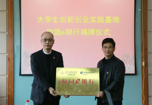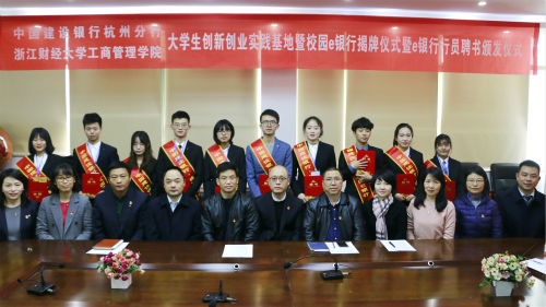 本网讯 12月6日,工商管理学院与中国建设银行杭州分行举行大学生创新创业实践基地签约暨校园e银行揭牌与e银行行员聘任仪式。中国建设银行杭州分行副行长翁开羽、机构客户经营部总经理倪海燕、网络金融部总经理吴洽强,工商管理学院院长董进才、党委书记黄卫华等出席仪式。