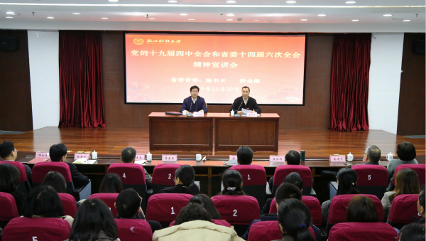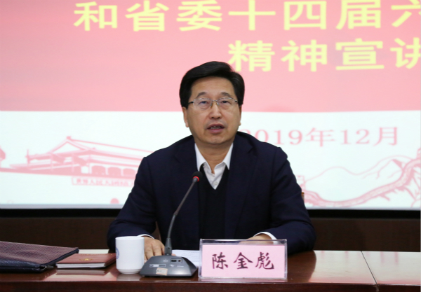 本网讯 12月20日,省委常委、秘书长陈金彪来到我校,宣讲党的十九届四中全会和省委十四届六次全会精神。会议由校党委书记李金昌主持。