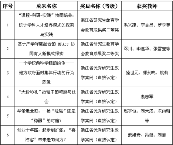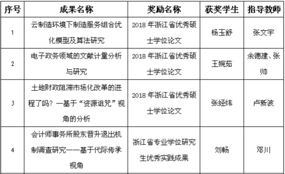 本网讯 近日,浙江省研究生教育学会公布了2019年研究生教育获奖成果,学校3篇研究生毕业论文获省优秀硕士学位论文、1项学生成果获评省专业学位研究生优秀实践成果、2项成果获省研究生教育学会教育成果二等奖、10个案例被认定为省优秀研究生教学案例。
