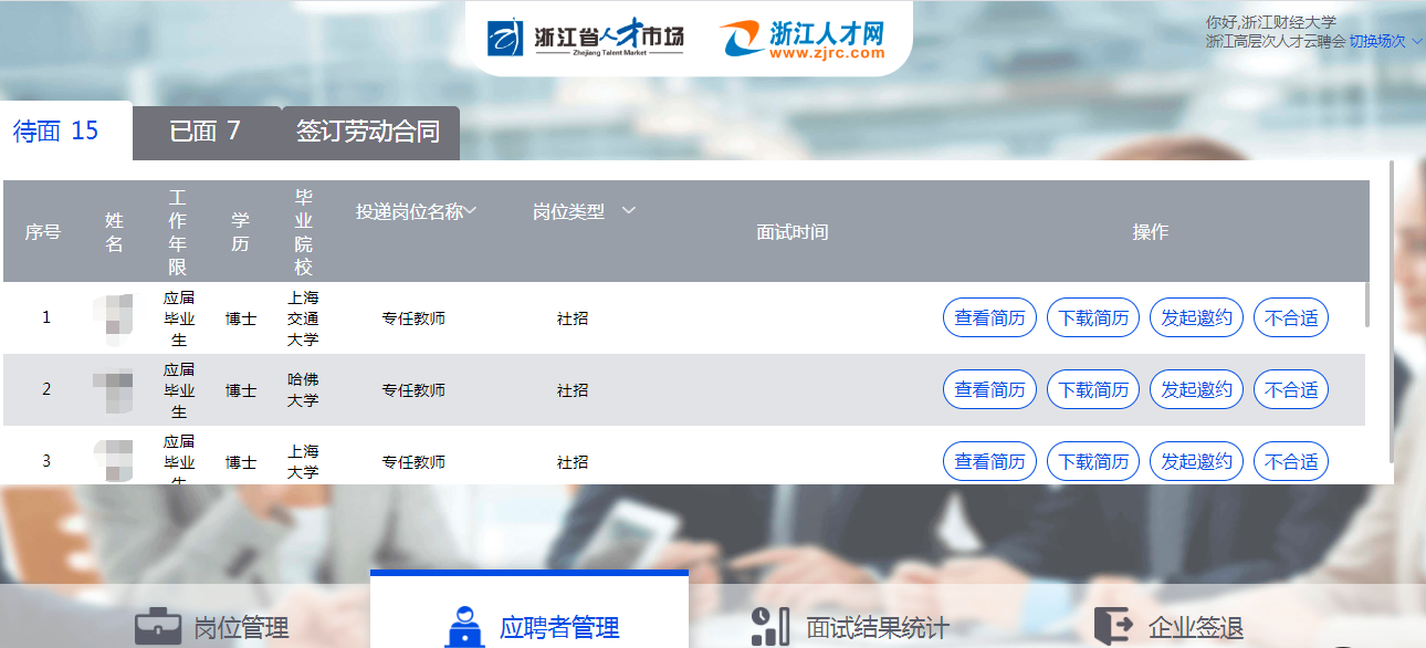 学校向多个海内外人才招聘平台投放招聘信息,参与省人才市场组织的“浙江省百万高层次人才云聘会”和上海教育人才中心组织的“2020年春长三角师资网络招聘专场”,通过视频面试宣讲引才招聘政策。发挥“校-院-学科”三级联动机制作用,动员专任教师加入人才引进的网络宣传,充分挖掘各种资源招揽优秀人才。截至目前,学校共计收到简历150余份,均已筛选转至相关学院。