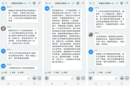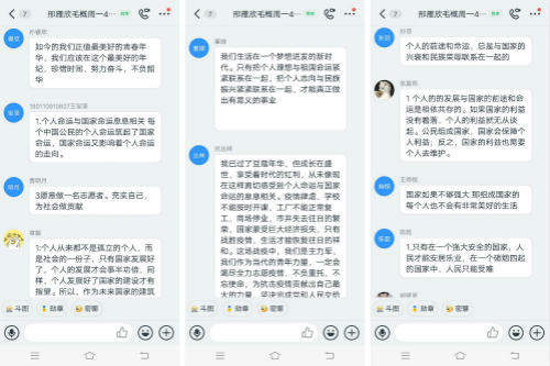 信智学院18级学生夏振宇同学表示,个人的力量是小的,但是当一个个微不足道的力量汇聚的时候就能迸发出很大的能量。张纪霖、金炼、董婧同学提到,我们每个人的命运都与国家、时代密切相关,国家是我们成长的摇篮和基础,把个人志向与民族振兴紧紧联系在一起,才能做出真正有意义的事业。陈梦娇、陈灵韬等同学表达了为祖国奋斗,努力学习、报效祖国的激情。王淑娴同学谈到自己的志愿者经历,还有更多的同学谈到了奉献和感恩。