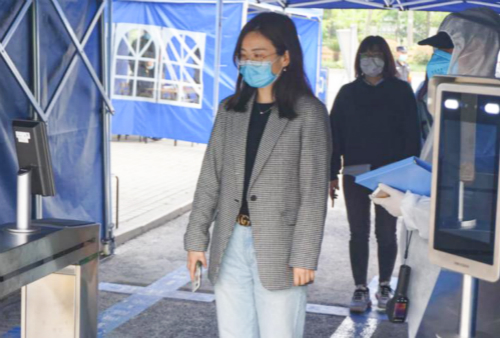 校门是校园疫情防控的第一道关口,学校在大门设车辆进出通道和人员进出通道。学生进校前,必须戴好口罩,相互间隔1米,排队等候检测体温。