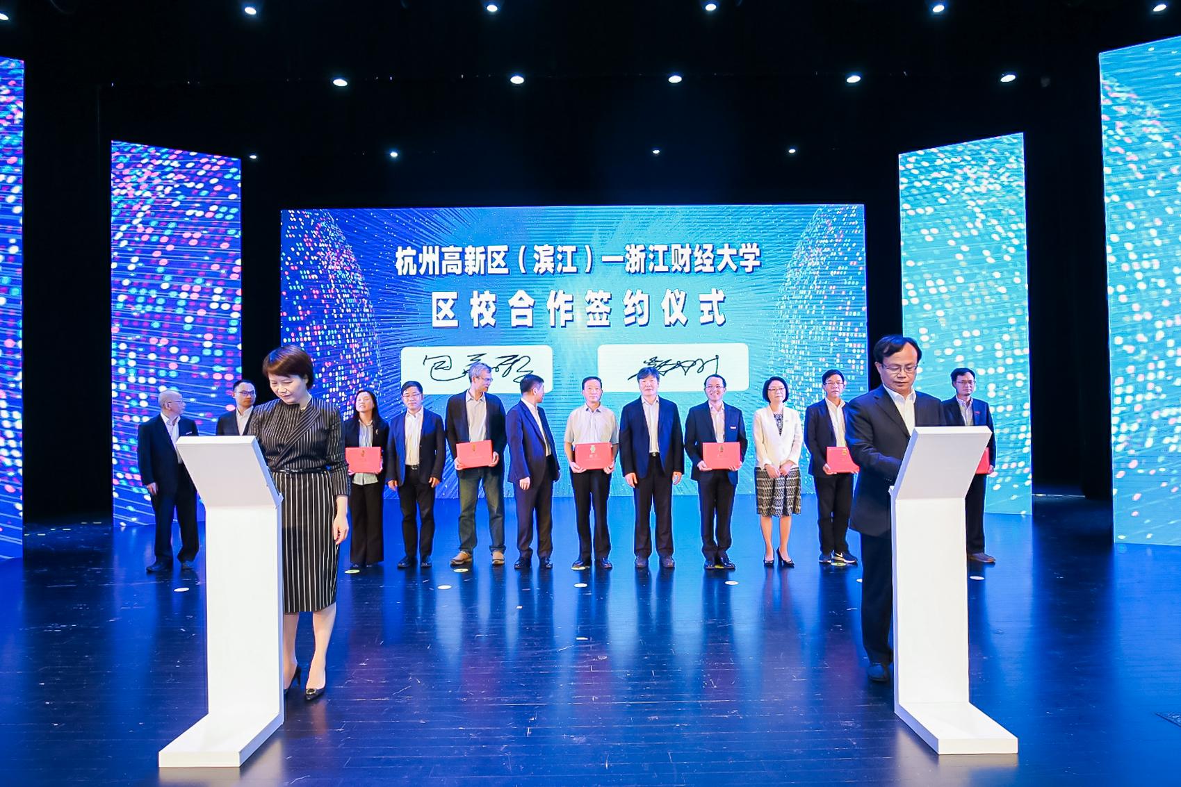 本网讯 4月29日,学校与高新区(滨江)人民政府举行战略合作协议签约仪式。校长钟晓敏、校党委副书记黄建新,省民政厅副厅长江宇,杭州市民政局局长何凌超,高新区(滨江)区委书记王敏、区长李志龙、区人大常委会主任韩建中、区政协主席王国珍等出席签约仪式。