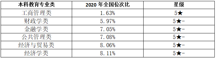 12个本科教育专业类中,经济与贸易类、经济学类由四星级升为五星级;工商管理类、财政学类、金融学类、公共管理类继续被评为五星级。