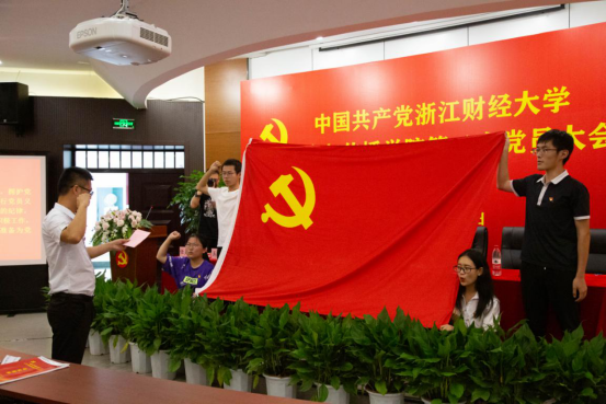 金融学院党委举行新发展党员入党宣誓仪式,老党员给新党员们佩戴党徽、赠送政治生日贺卡,学院党委书记以“让青春在党和人民最需要的地方绽放绚丽之花”为主题给师生党员上党课。
