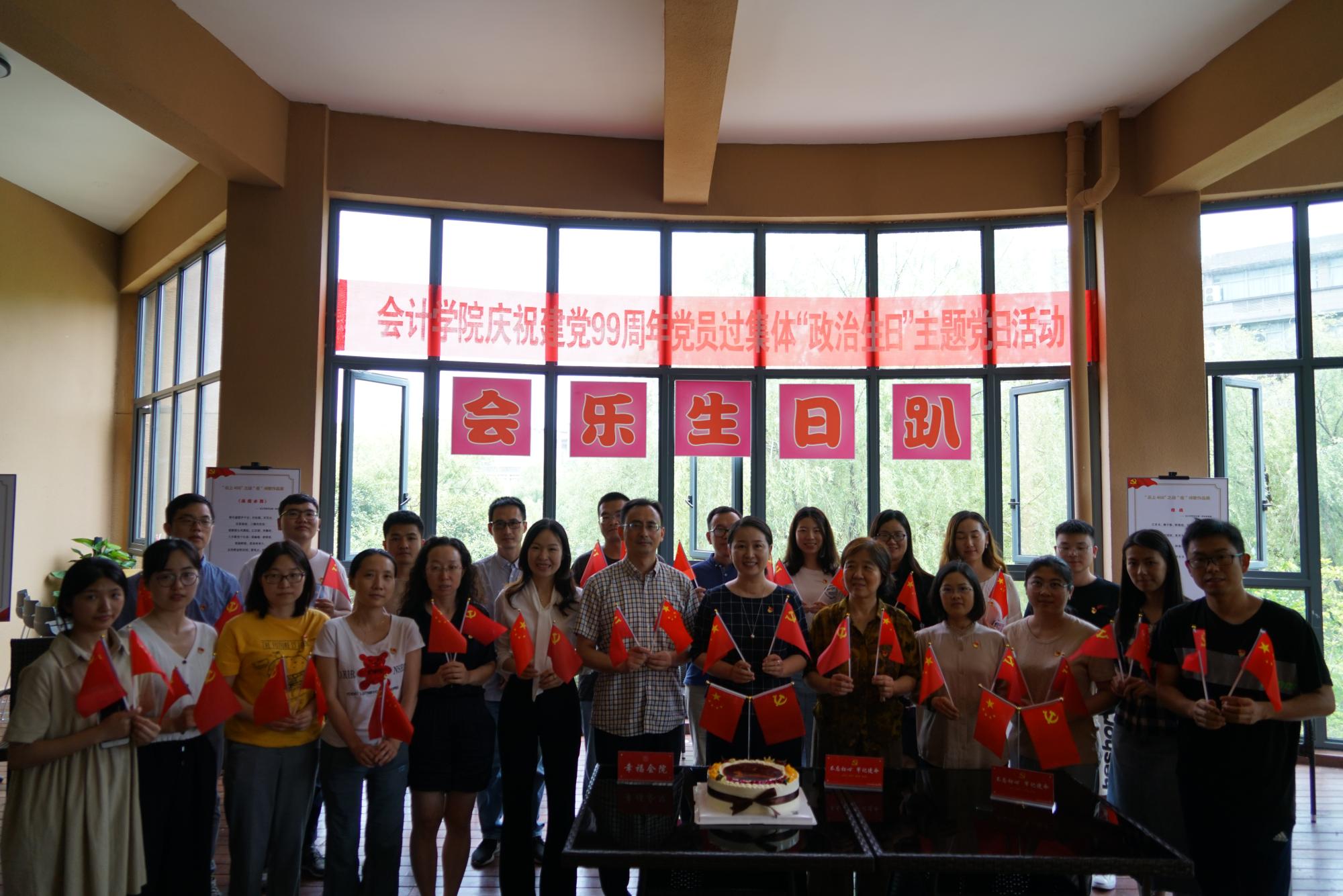 会计学院党委举行“庆祝建党99周年 集体过党员‘政治生日’”主题党日活动。全体党员面对鲜红的党旗,高举右手,重温入党誓词,共过集体“政治生日”,为党庆生。