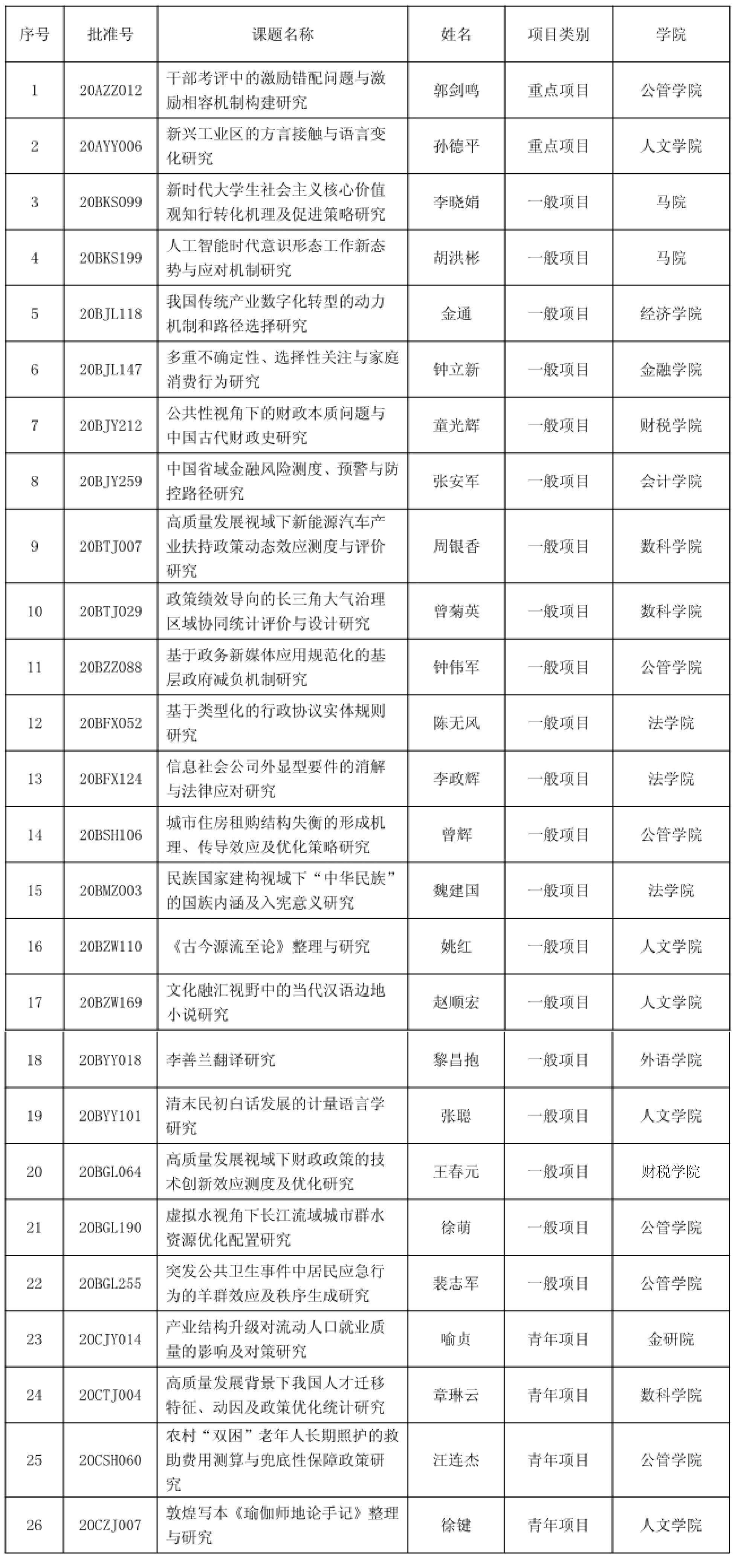 本网讯 近日,全国哲学社会科学工作办公室公布了2020年国家社科基金年度项目和青年项目评审结果,学校共立项26项。其中重点项目2项、一般项目20项、青年项目4项。立项数创历史新高。