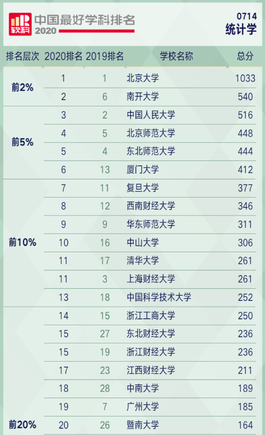 本网讯 近日,软科公布了2020软科中国最好学科排名,学校共有7个学科上榜。其中,应用经济学再度跻身软科中国最好学科排名前10%,较上一年度上升了7个位次;统计学居前20%,较上一年度前进了4个位次;工商管理、公共管理、管理科学与工程居前30%;法学、外国语言文学也再次进入了榜单前50%。
