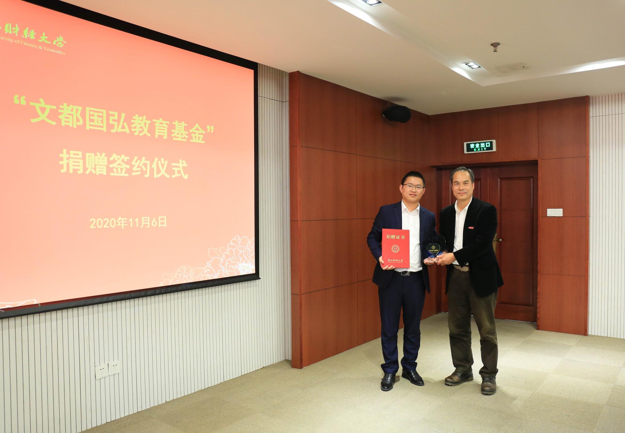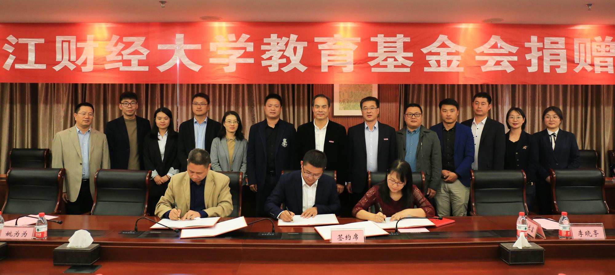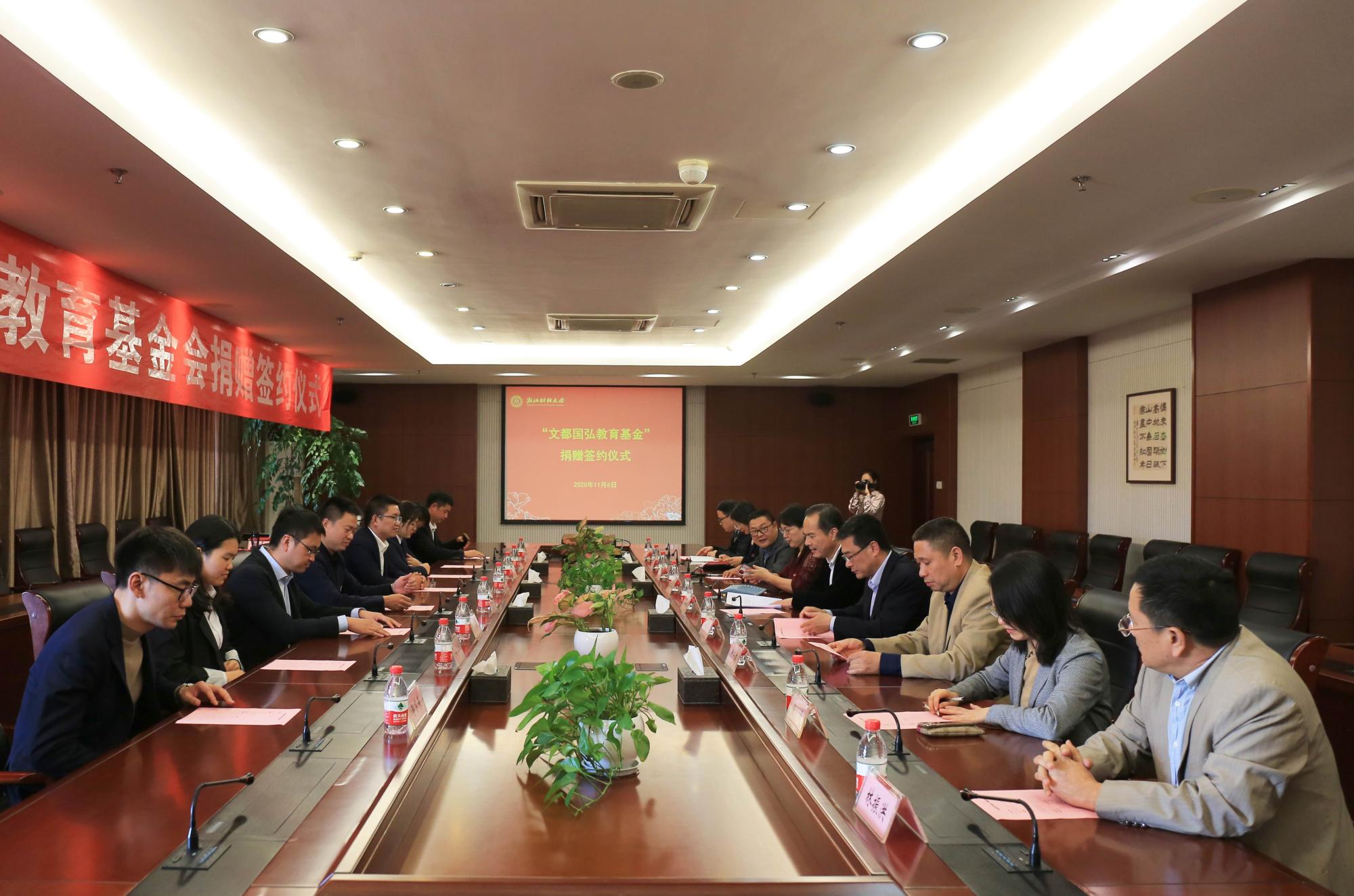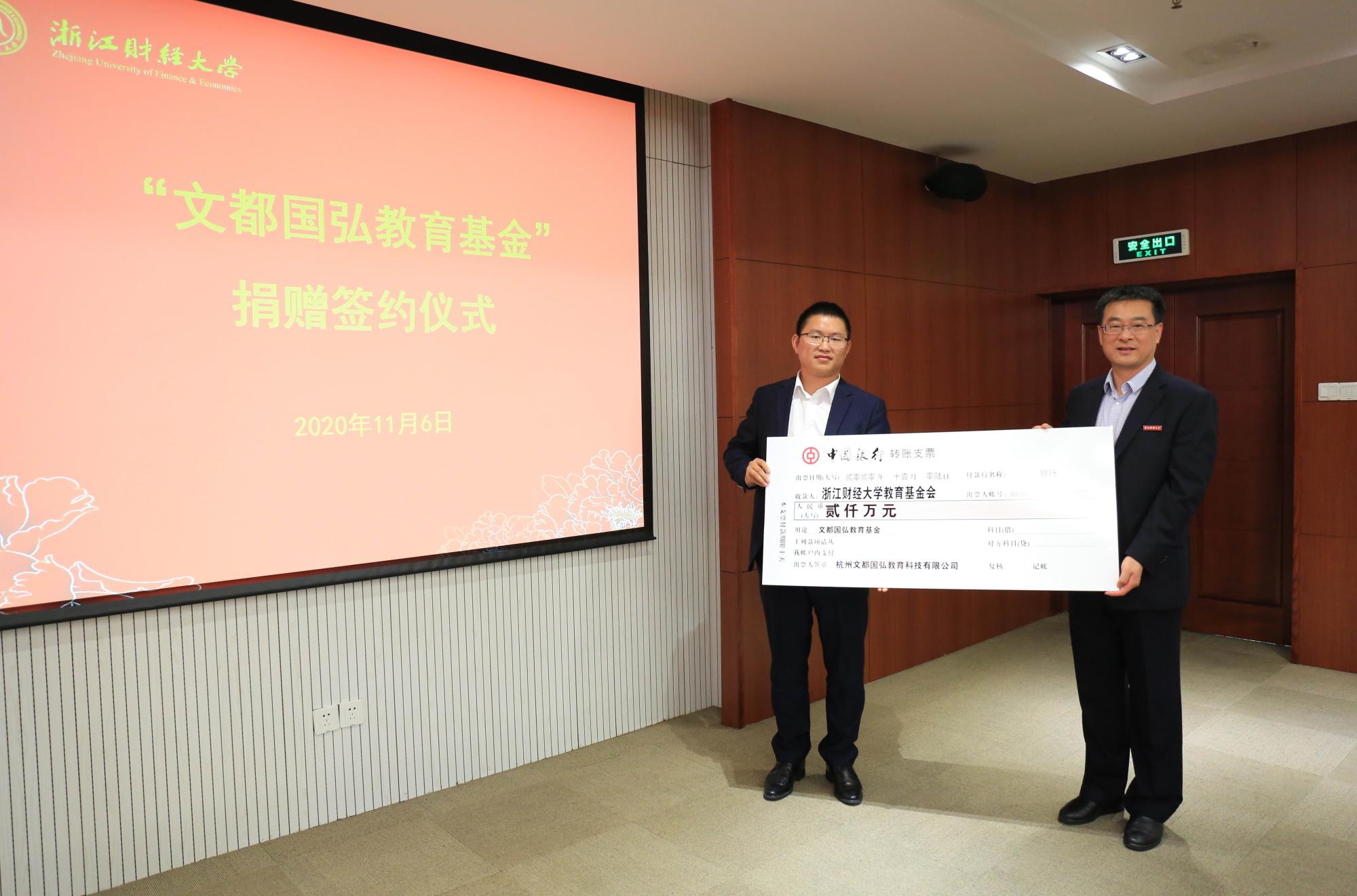 本网讯 11月6日,文都国弘教育基金捐赠签约仪式在我校下沙校区举行,杭州文都国弘教育科技有限公司出资2000万成立“文都国弘教育基金”。校友总会副会长、副校长王奎泉,校友总会副会长兼秘书长、副校长徐晓东,文都教育集团张进瑜先生,杭州文都国弘教育科技有限公司杜长富先生等出席捐赠签约仪式。