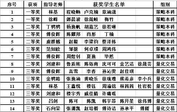 本次大赛吸引了来自全省74所高校的1094支队伍报名参赛。比赛分为投资策略组、市场交易组和量化交易组三个组别。历经初赛、复赛、决赛的角逐,最终评出一等奖75项、二等奖150项、三等奖225项。