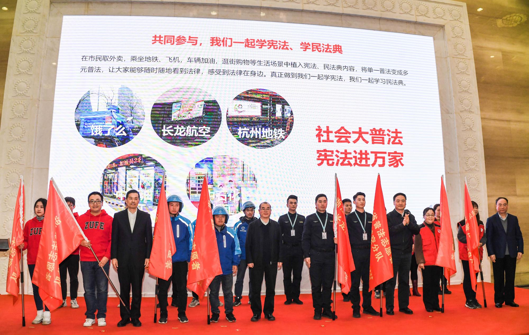 本网讯 近日,由省委宣传部、省司法厅主办的第七个国家宪法日宣传活动暨“七五”普法成果展在杭州正式启动。省委常委、宣传部部长朱国贤,省人大常委会副主任赵光君,省政府副省长刘小涛,省政协副主席马光明等出席启动仪式。刘小涛为我校普法队伍授旗,标志着我校普法志愿者队伍升级为省级直属普法队伍。