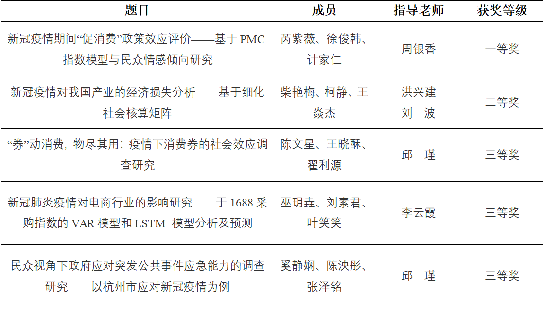 本届大赛的主题是“重大突发事件对经济社会影响的统计测度”,由中国统计教育学会和全国应用统计专业学位研究生教育指导委员会主办。大赛历时9个月,吸引了全国共计271支队伍参赛,最终评选出一等奖20支、二等奖40支、三等奖80支。我校数据科学学院5支研究生队伍参加了竞赛,并获得一等奖1项、二等奖1项、三等奖3项的好成绩。