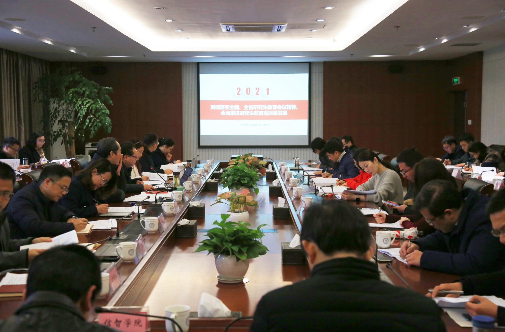 会上还传达了全国、全省研究生教育会议精神,并就一级学科博士点申报、全国第五轮学科评估、全国专业学位水平评估、省重点高校及优势特色学科建设、学位点周期性合格评估、学科交叉人才培养改革试点、培养方案修订、教学资源建设、研究生招生就业、研究生心理健康教育等作了部署。