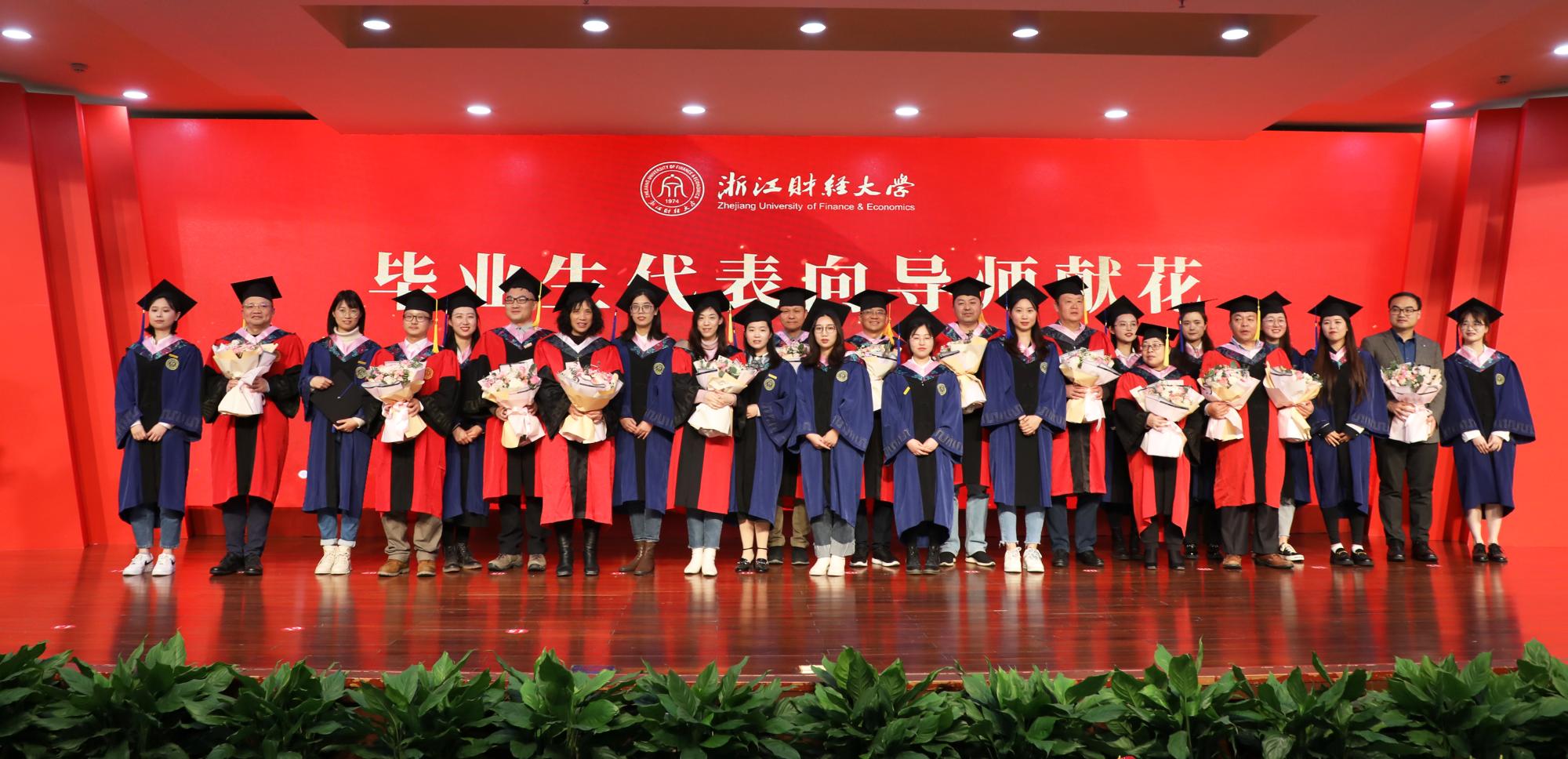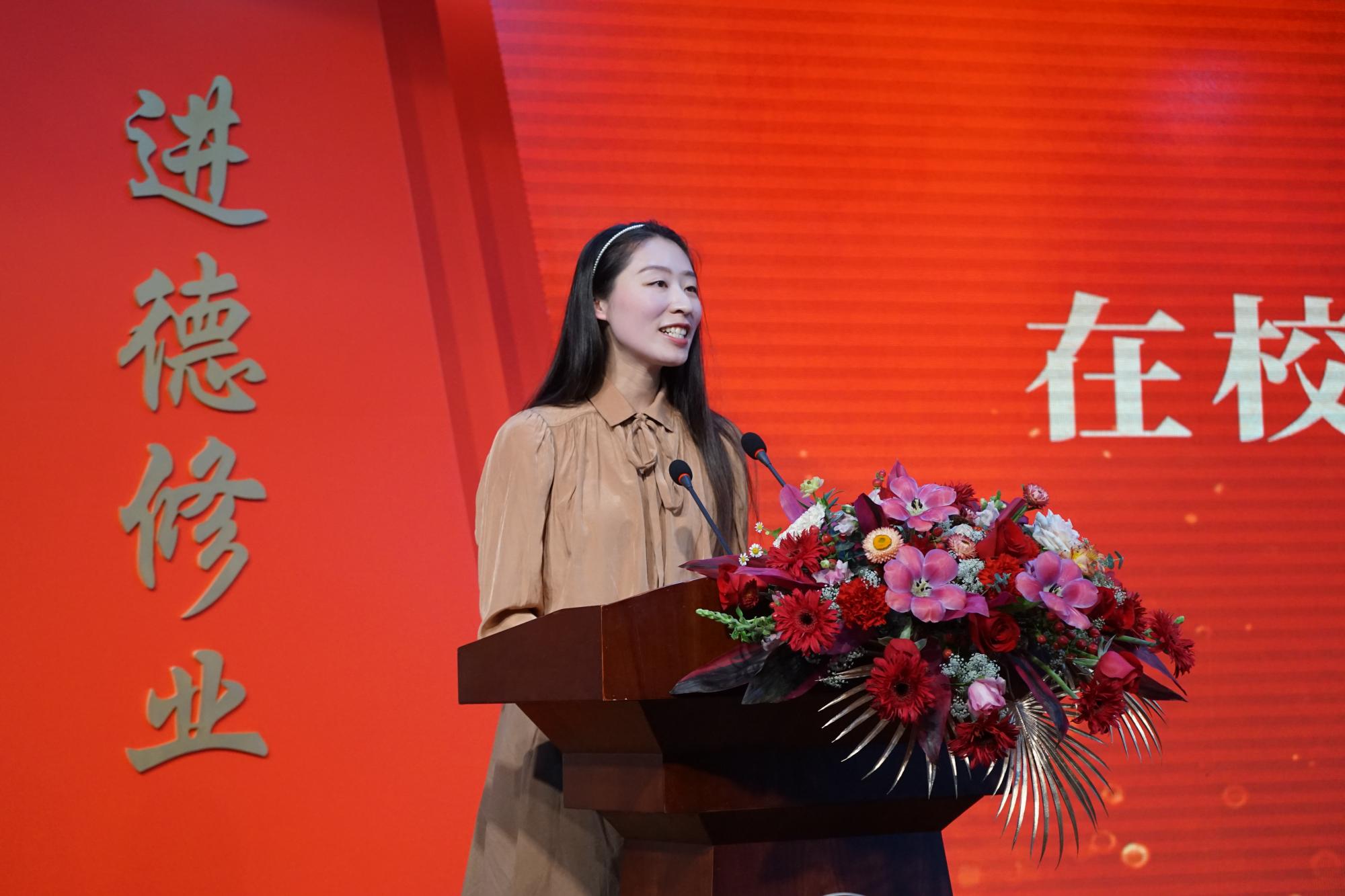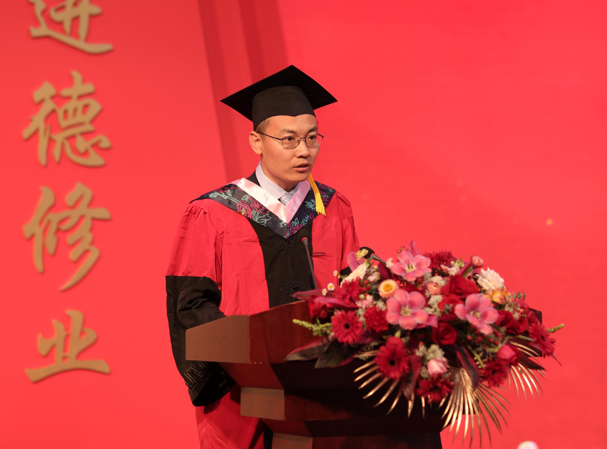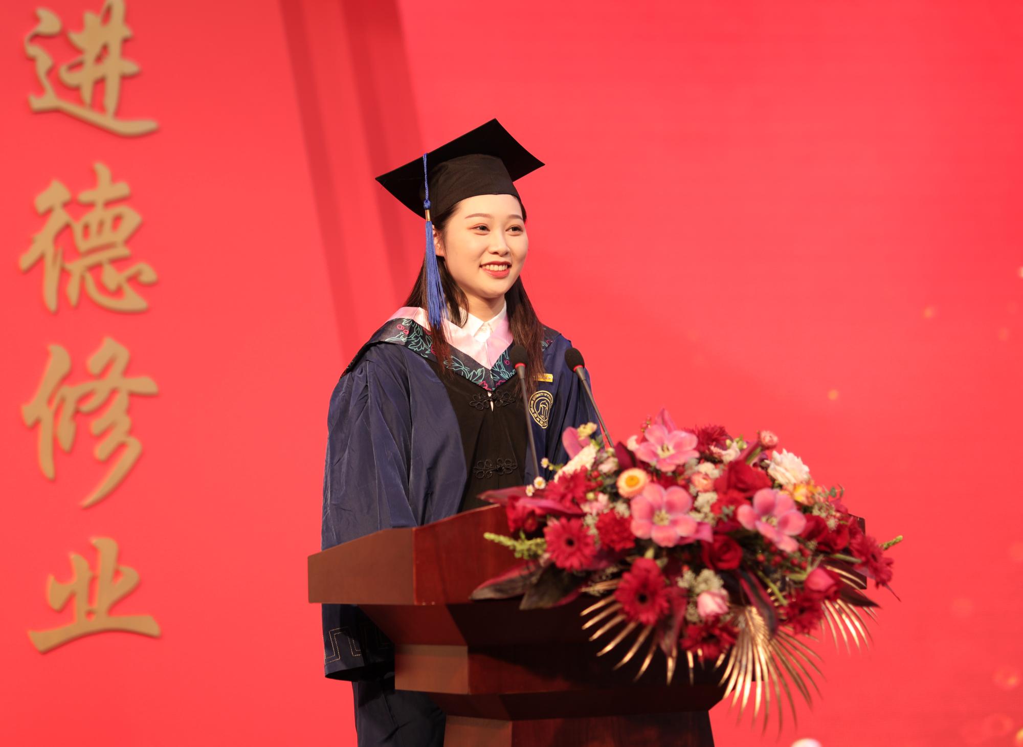 导师代表王岭、毕业研究生代表廖丁瑶、在校研究生代表杨畅分别在典礼上发言。毕业生代表向导师献上花束,表达学子的感恩与不舍。
