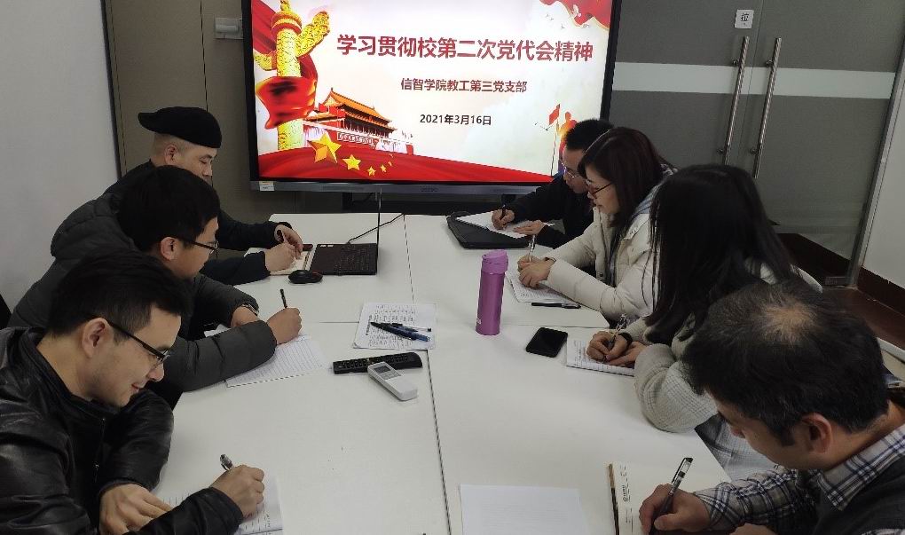 信智学院党委多层次、多形式、全覆盖开展校第二次党代会精神学习。学院党委理论学习中心组于一月组织专题学习,4个教工党支部和5个学生党支部在三月通过主题党日活动、专题学习会等形式开展丰富多彩的学习活动。学院中国特色社会主义理论学习会将党代会党委工作报告和纪委工作报告编入2021年第一季度学习材料,目前已在学院官方公众号上推出校第二次党代会教职工政治理论专题学习2期。