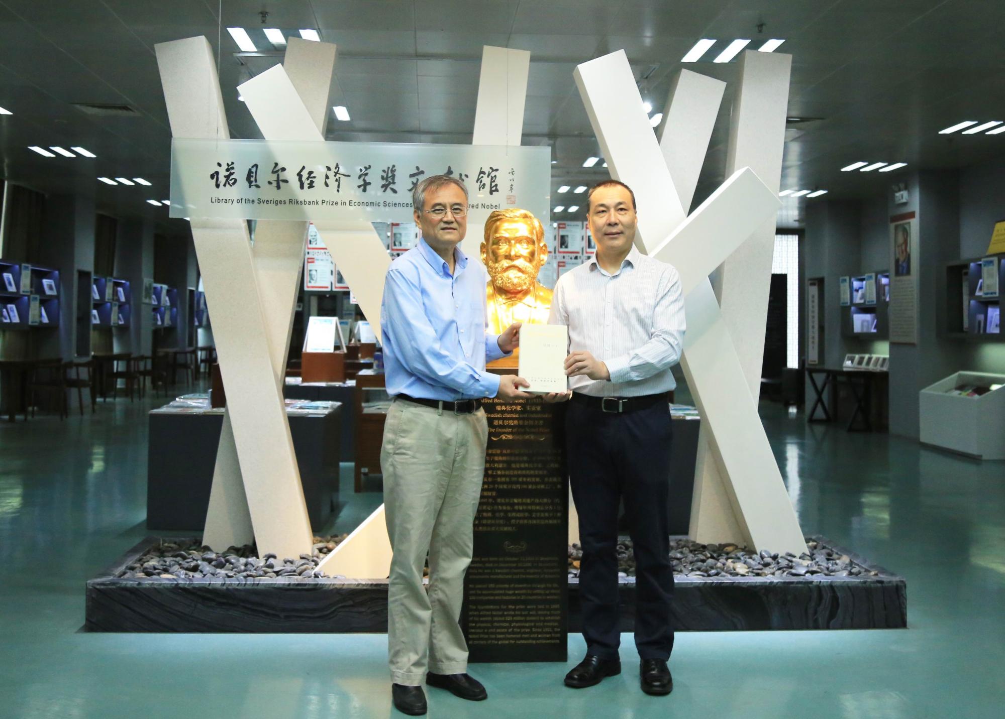 上午,在校党委书记李金昌陪同下,钱颖一教授参观了孙冶方经济科学奖文献馆和诺贝尔经济学奖文献馆,并向文献馆赠送了其签名著作《理解现代经济学》,李金昌代表学校接受了赠书。钱颖一教授充分肯定了学校近年来人才培养和学术研究取得的丰硕成果,对学校“两奖”文献馆的建设表示了赞赏,并回忆了他和多位“两奖”得主的友谊。