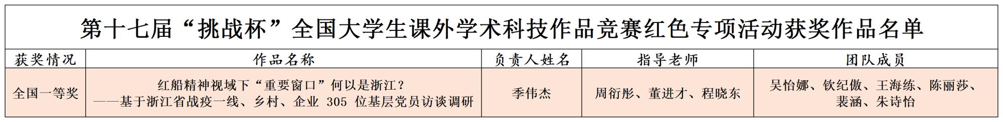本网讯 近日,浙江省第十七届“挑战杯”大学生课外学术科技作品竞赛决赛落下帷幕。经过激烈角逐,学校荣获特等奖1项、二等奖6项、三等奖11项和最佳进步奖。在红色专项活动中,学校共有2支队伍获得“浙江省百优队伍”称号,其中1支荣获第十七届“挑战杯”全国大学生课外学术科技作品竞赛红色专项活动一等奖。