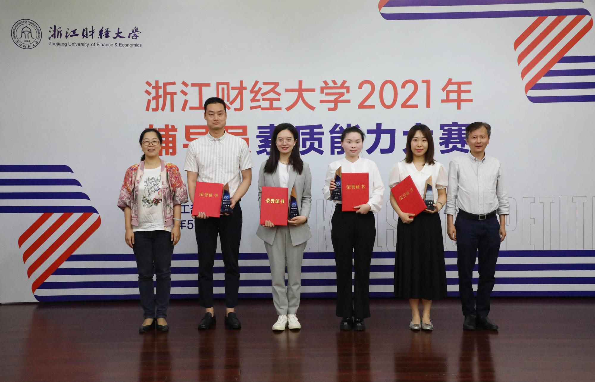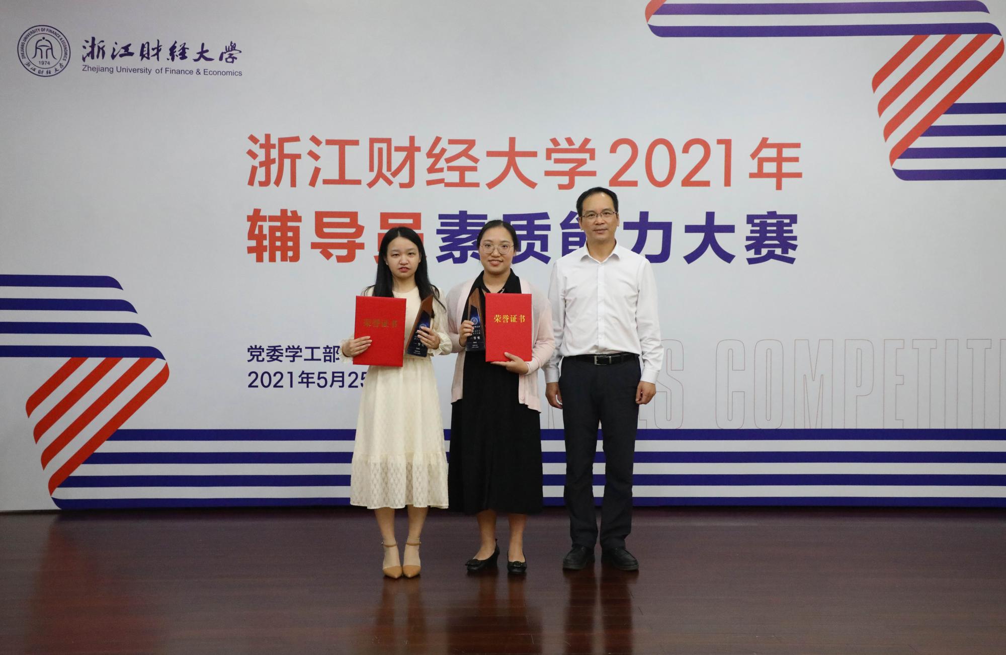 中国计量大学学工部部长赵蓓茁(左一)、杭州电子科技大学学工部部长陈巍(右一)为二等奖选手颁奖