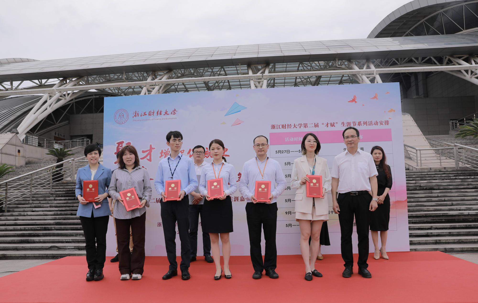 开幕式上,中信证券业务中心、阿里招聘中心、毕马威等6家企业人力资源部负责人和学校12位教师受聘为大学生生涯导师。大学生生涯导师代表、中信证券业务中心副总经理徐虹莱和学生代表、会计学院18资产评估专业研究生林飞腾作了分享交流。