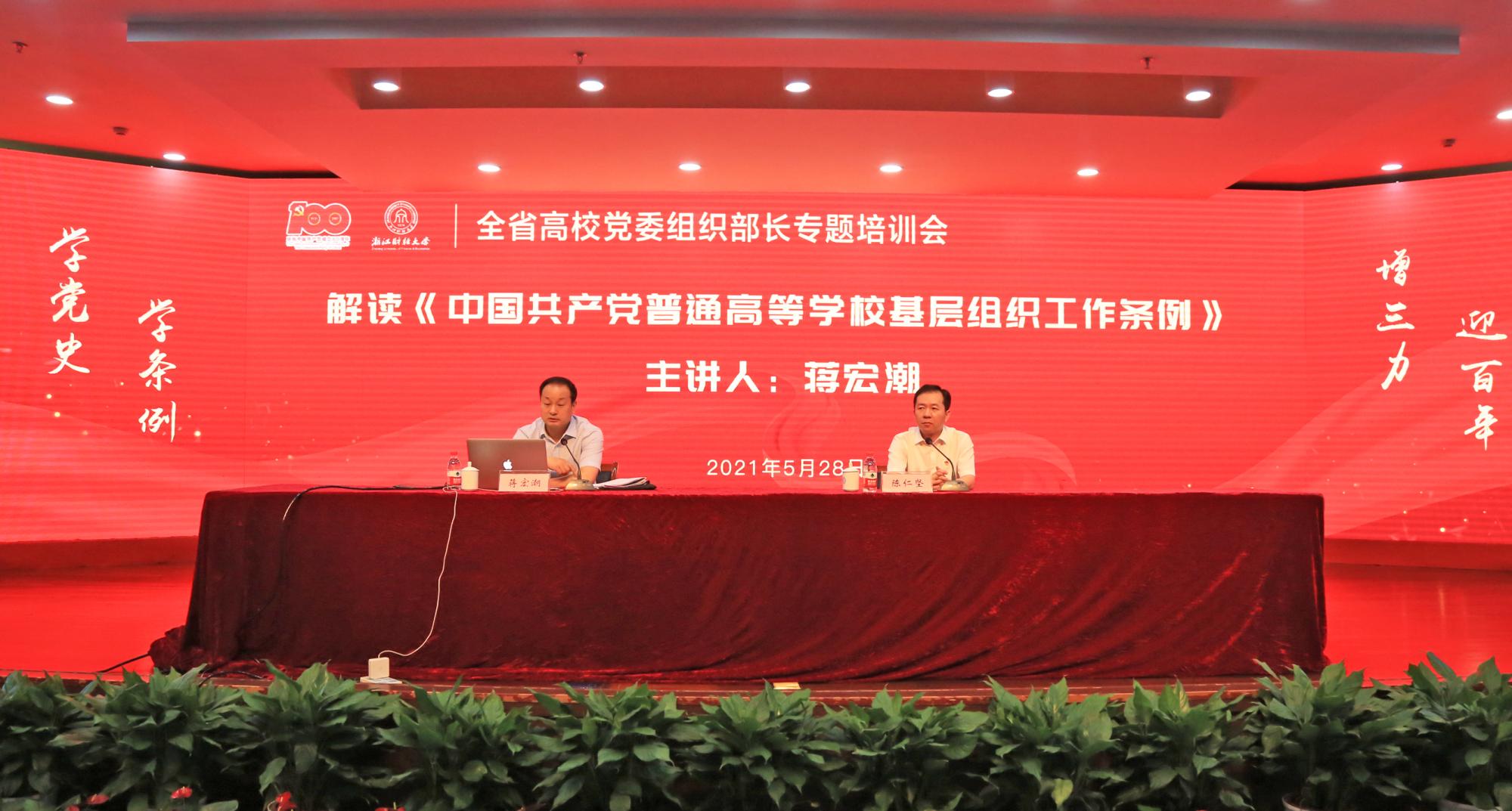 本网讯 5月28日,全省高校党委组织部长专题培训会在我校下沙校区举行。教育部思政司党建统战处处长蒋宏潮应邀作《中国共产党普通高等学校基层组织工作条例》专题培训。省教育厅组织处处长陈仁坚主持专题培训会。校党委书记李金昌代表学校对蒋宏潮的到来表示欢迎和感谢。校党委副书记黄建新、全省高校党委组织部长、下沙高校党员干部校际联合培训班学员、学校优秀年轻干部培训班学员等共500余人参加培训会。
