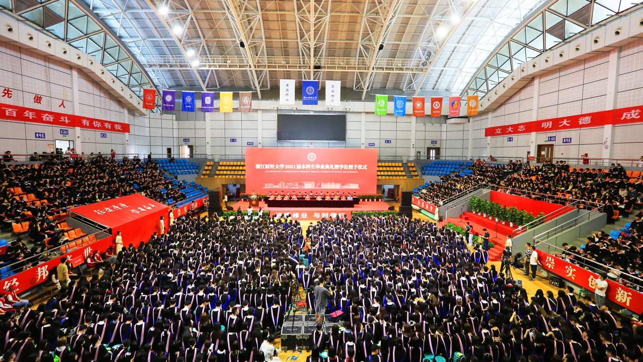 李金昌、钟晓敏、黄建新、余建森、王奎泉、孙旭东、徐晓东、董进才、申屠莉、楼胆群等校领导出席典礼。校友代表、相关职能部门主要负责人、各学院分管学生工作副书记、教师代表、辅导员代表,2021届全体毕业生及毕业生家长代表共3500余人参加。典礼由校党委副书记余建森主持。
