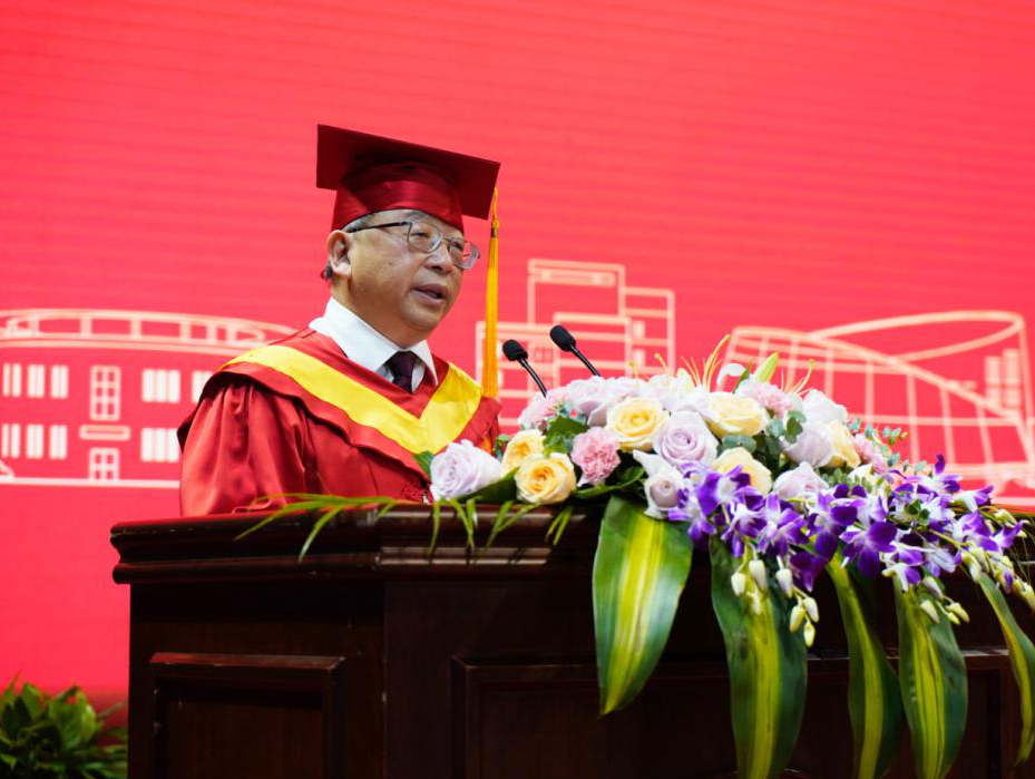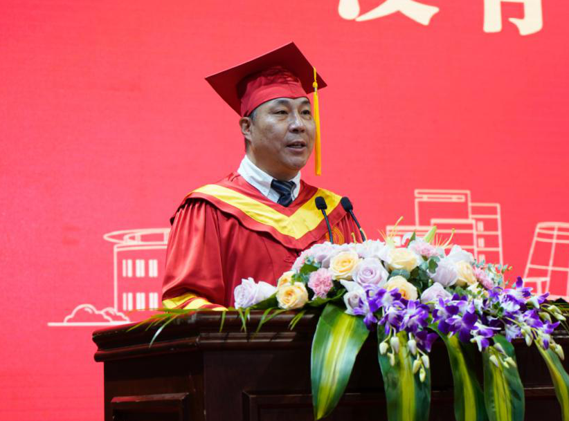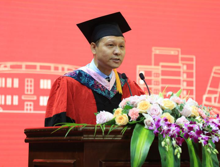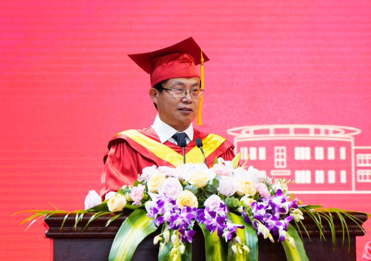 校长钟晓敏作了题为《风华正茂迎百年 砥砺奋斗致青春》的致辞。他指出,2021届毕业生正处在“两个一百年”奋斗目标的历史交汇期,新的百年征程,必定是铸就精彩人生的芳华时代,大家既面临着难得的建功立业的人生机遇,也面临着“天将降大任于斯人”的时代使命。他以“奋斗”二字为赠言寄语大家,希望2021届毕业生带着“奋斗”再出发,让奋斗成为青春字典的“关键词”、成为人生路上的“主旋律”:一为奋斗青春擦亮底色,胸怀家国,心有大爱。以社会主义建设者和接班人的责任担当,把青春智慧和力量转化为推动经济发展、社会进步、人民幸福的生动实践,以青春之我、奋斗之我为民族复兴铺路架桥、为祖国建设添砖加瓦。二为奋斗青春永葆本色,锤炼品德,完善人格。无论是继续深造还是在工作岗位上,都要坚守学术道德、职业道德和做人底线,不随波逐流、不凌空虚蹈、不精致利己,踏实做事、诚实为人、心怀感恩。三为奋斗青春夯实成色,增强本领,积蓄能量。要保持精力旺盛、思维活跃的优点,继续严格要求自己,不断地虚心请教、躬身实践,钻研业务、提升素养。四为奋斗青春增添亮色,求真务实,勇毅前行。在今后面临学习困惑、工作焦虑、现实压力时,少一些急功近利、多一些积极行动,少一些“坐而论道”、多一些“起而行之”。