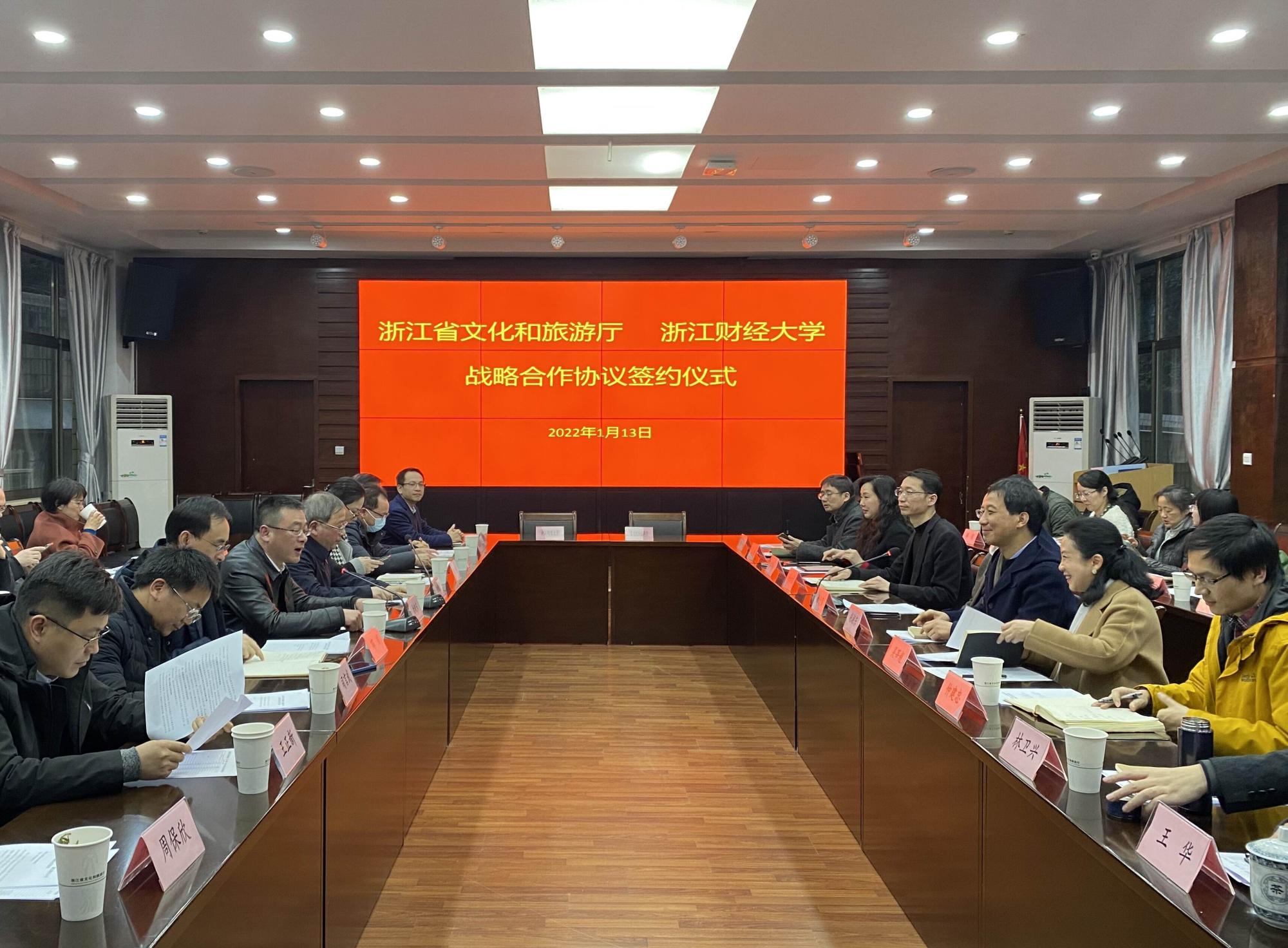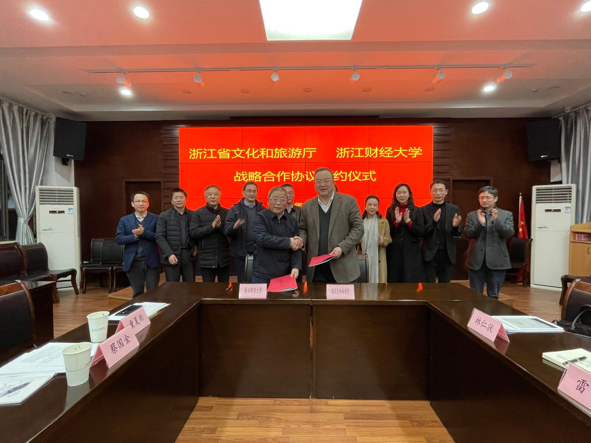 本网讯 1月13日,学校与省文旅厅举行教产学研全面战略合作协议签约仪式。省文旅厅党组书记、厅长褚子育,校长钟晓敏,副校长徐晓东等出席签约仪式。