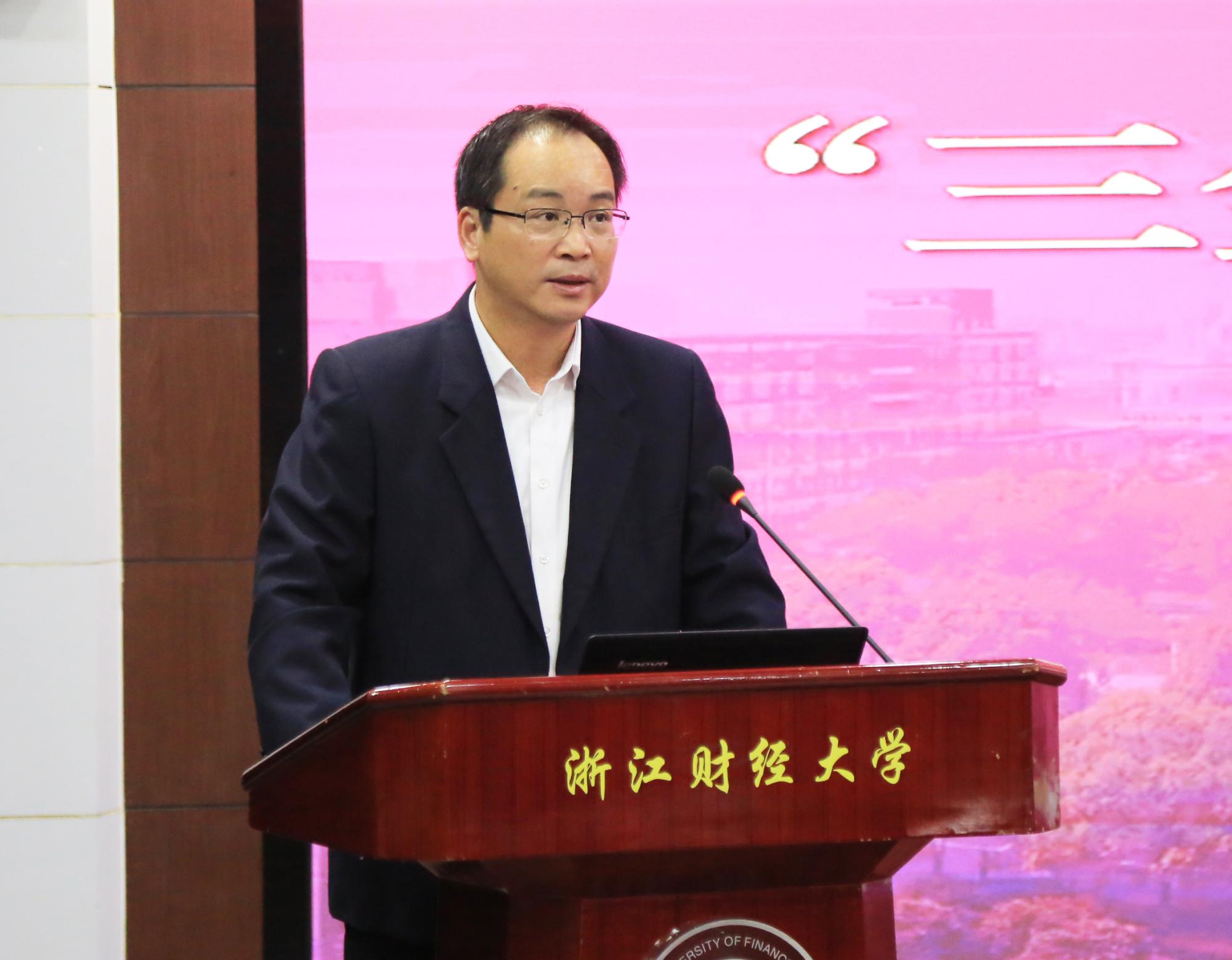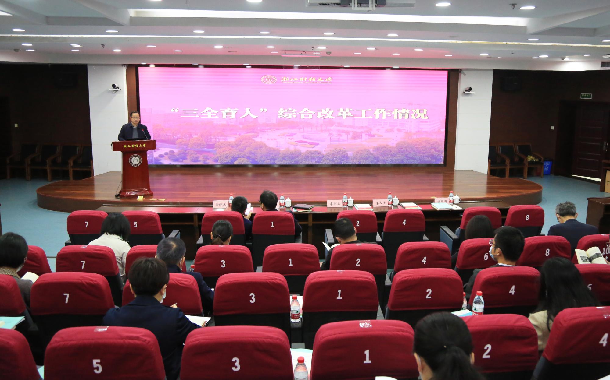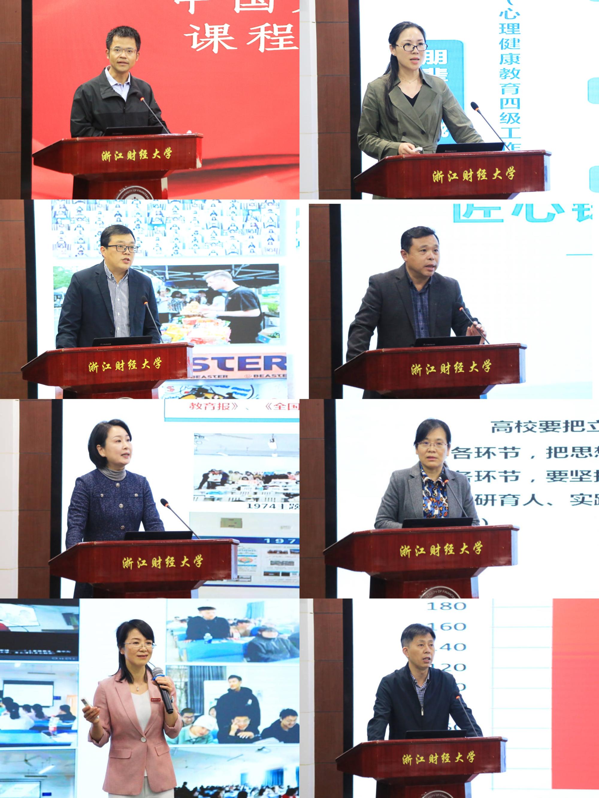 会上,教务处处长李政辉以《“中国元素 浙江味道 财经特色”课程育人体系的探索与实践》为题,围绕课程思政体系的建设路径和阶段性成果,介绍了学校从顶层设计到每一堂课的课程育人体系建设。学生处处长曹桢以《“五域双驱动”一体化心理育人模式建构》为题,分享了构建“个体自助域、朋辈互助域、教育者帮扶域、专业助力域、社会支持域”一体化心理育人模式的工作经验与做法。团委书记陆颋浩以《“育人于行,知行并重”全周期实践育人体系创新探索》为题,分享了全领域协同、全时域覆盖、全区域渗透的实践育人体系,取得的阶段性成果以及未来努力方向。后勤服务中心主任朱力明以《匠心铸魂强保障,服务育人迈新程》为题,从党建统领、活动聚力、问题导向、防疫担当、质效并进分享了后勤服务中心以实干护航学校发展,提升师生获得感、幸福感的经验做法。会计学院党委书记张虹围绕“1974”项目建设理念、建设情况和建设成效,分享了基于守正创新理念的会计学院“三全育人”实践探索。财税学院党委书记童玉玲围绕现实问题、解决思路和工作方案,分享了党建统领“一核四脉多平台”的组织育人实践经验。马克思主义学院李意老师从自身教学实践出发,围绕马克思主义学院的顶层设计、基层创新、全员参与、全课渗透的全方位思政育人大格局,分享了《思想道德与法治》课程“三全育人”改革的探索与实践。信智学院院长张帅从科研育人角度,分享了构建基于跨学科团队协同的精细化培养大厦蓝图和基于“三趣驱动”和“四维协同”的学硕精细化育人体系经验与育人成果。
