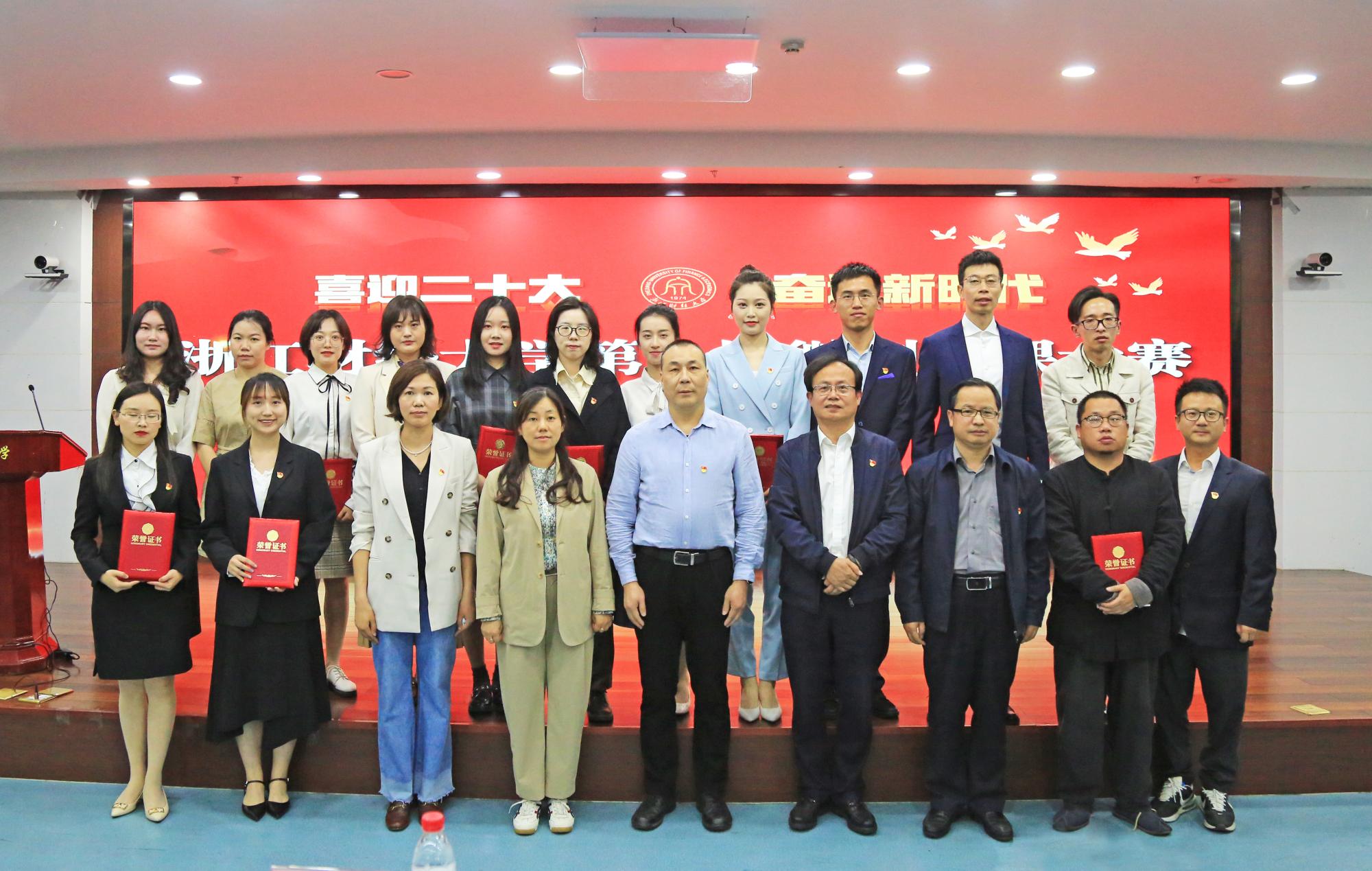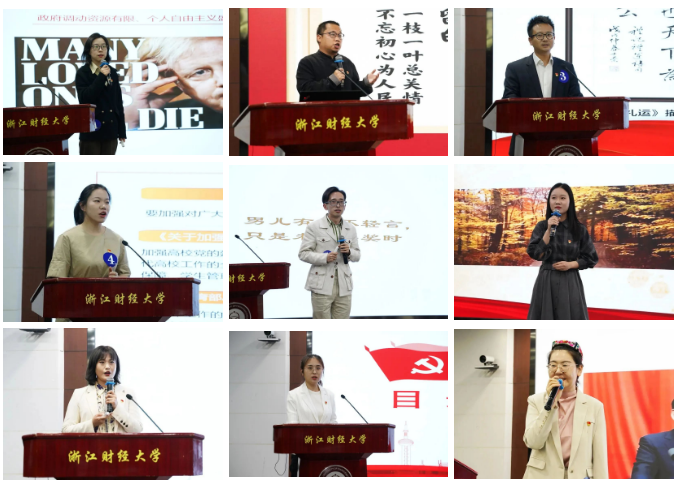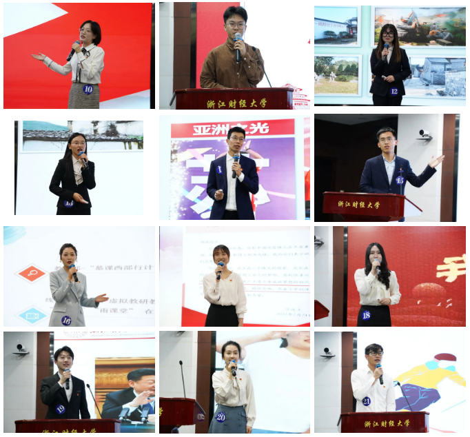 活动现场,21位参赛选手依次登台,围绕“喜迎二十大 奋进新时代”这一主题,结合浙江发展实际和自身经历,讲“共同富裕”“理想信念”“乡村振兴”,讲“幸福”“创新”“奋进”,通过生动的故事、鲜活的案例和朴实的语言,在6分钟时间内为现场评委和观众呈现了一堂堂精彩纷呈的微型党课,充分展现了财大师生党员的宽阔视野和深邃思想,激发了广大党员奋进新时代的磅礴力量。
